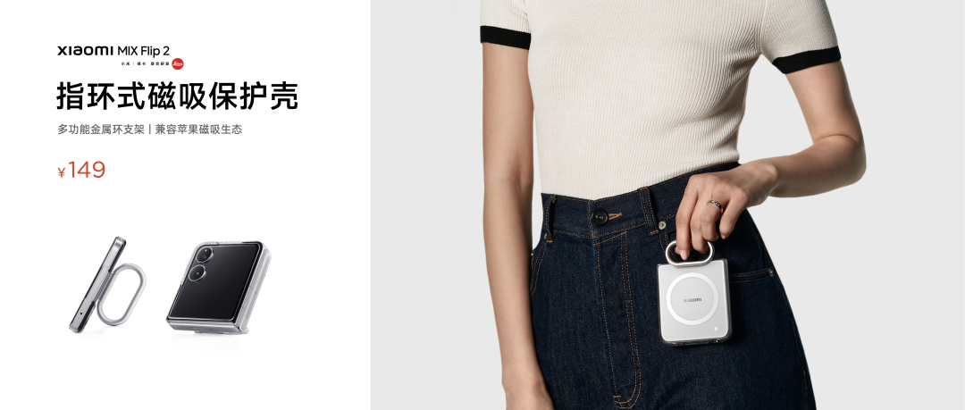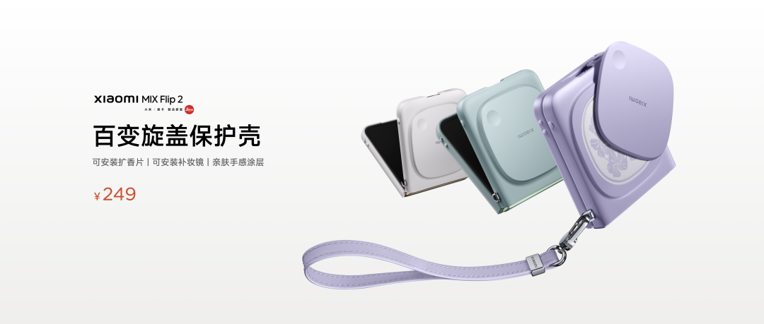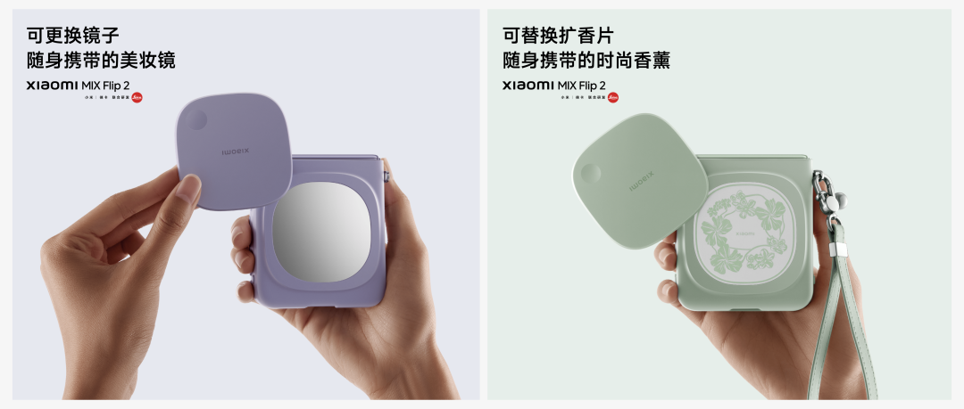 我们还推出了一系列配件组合:时尚挂链套装,一长一短两条绳链,可手提可斜挎;指环式磁吸保护壳,兼容磁吸生态,可搭配更多磁吸配件;旋盖保护壳,可替换扩香片和化妆镜,兼顾时尚和实用性。