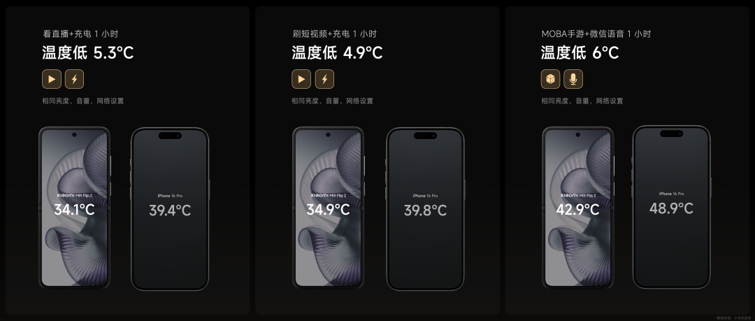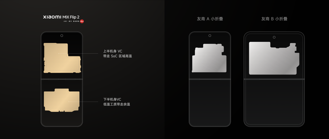 Xiaomi MIX Flip 2 搭载骁龙 8 至尊版移动平台,能效大幅跃升。我们还为它重新设计了一套散热系统:创新的双 VC 立体散热,上侧 VC 采用凸台设计,离热源更近,充分带走 SoC 温度;第一次在机身下侧放入一枚低温工质 VC,启动温度比传统 VC 更低,更快参与整机均热,带走余温。实测日常复合场景和游戏场景,温度均低于 iPhone 16 Pro。