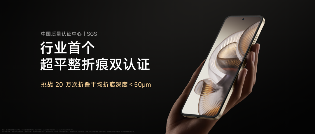 配合全新升级的 50μm UTG 超韧柔性玻璃,不仅带来行业第一梯队的内屏平整度,更大幅提升内屏抗冲击和整机跌落性能。它也成为了行业首个获得中国质量中心和SGS 超平整折痕双认证的产品。