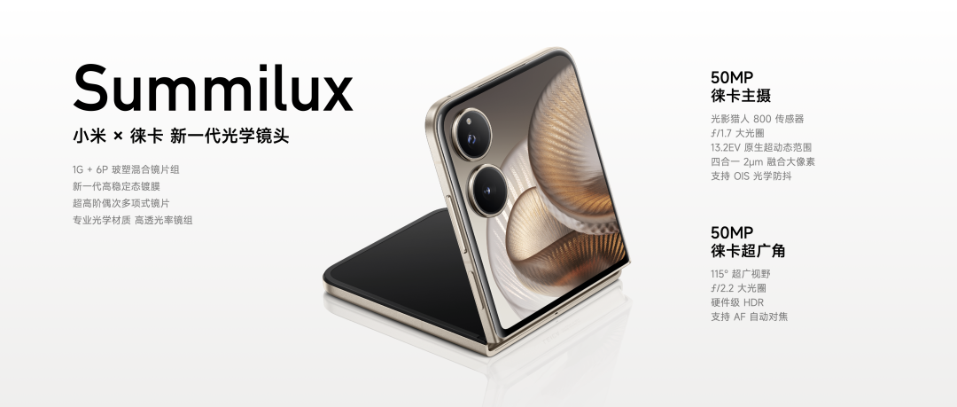 Xiaomi MIX Flip 2 搭载徕卡 Summilux 光学系统,超纯光学素质,真实还原光影细节;一颗 50MP 徕卡主摄和一颗 50MP 徕卡超广角,满足多焦段记录需求。